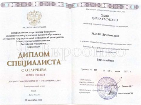 2022Диплом по специальности «Лечебное дело», Кубанский государственный медицинский университет