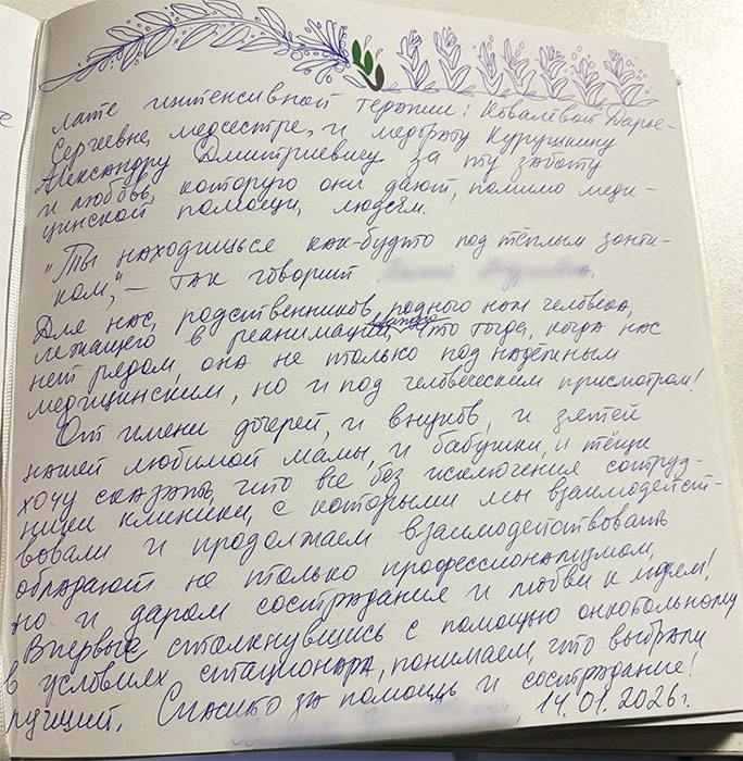 Особенно теплые слова благодарности мама передает Аптекарь Валерии Владимировне, врачу-реаниматологу, и её смене в палате интенсивной терапии: Ковалевой Дарье Сергеевне, медсестре, и медбрату Курушкину Александру Дмитриевичу за ту заботу и любовь, которую они дают помимо медицинской помощи людям.