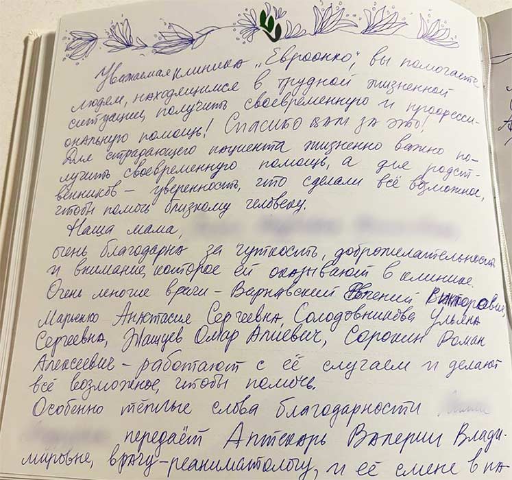 Уважаемая клиника "Евроонко", вы помогаете людям, находящимся в трудной жизненной ситуации, получить своевременную и профессиональную помощь! Спасибо вам за это!