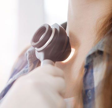 - Дерматоскопия – неинвазивный метод исследования с применением оптического прибора, увеличивающего изображение в десятки раз. Позволяет визуализировать структуру образования кожи, сосудистый рисунок, пигментные включения и иные признаки, указывающие на возможное злокачественное перерождение.